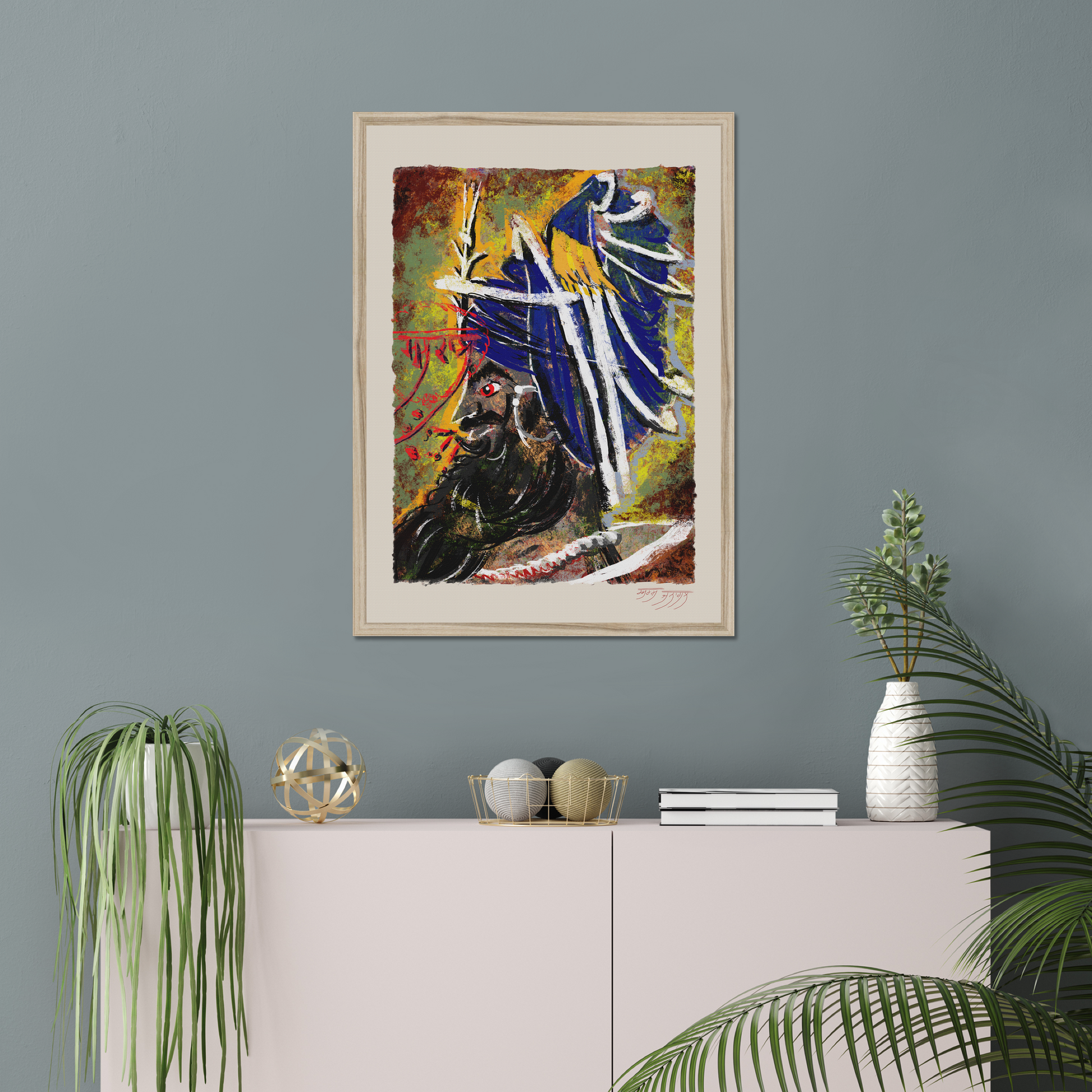 This work by Arshdeep Singh channels the primal energy of Mahakaal , the timeless force that dissolves fear and awakens inner sovereignty. The textured surface, carved with palette-knife precision, mirrors the discipline and ferocity of the Khalsa ideal: strength contained within silence, chaos refined into order.